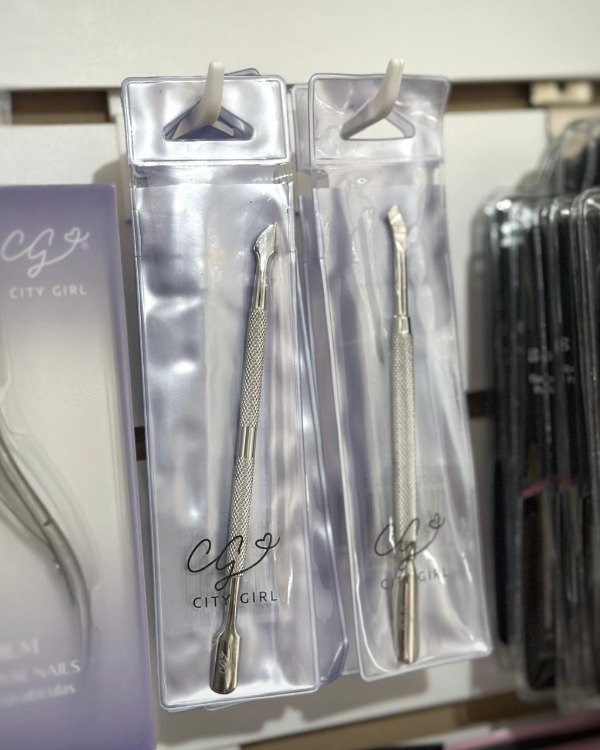 Repujador metálico. Cabezal curvo ideal para manicuría tradicional y cabezal de raspado que permite desprender el excedente de cutícula antes de realizar el esmaltado.