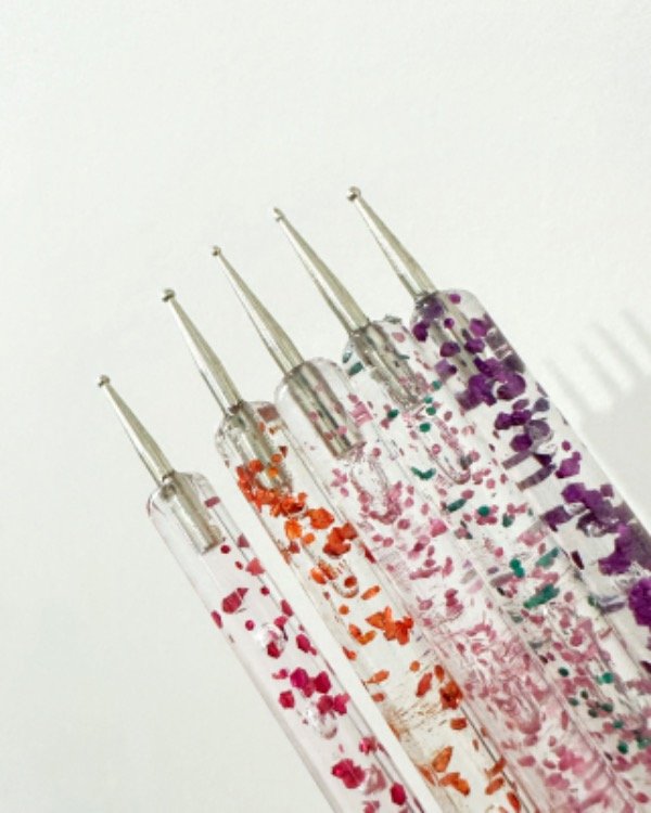 Herramienta con doble cabezal metálico para realizar lunares y decoraciones sencillas.