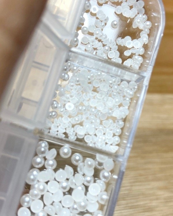 Organizador plástico con 12 divisiones con diferentes tamaños de perlas.