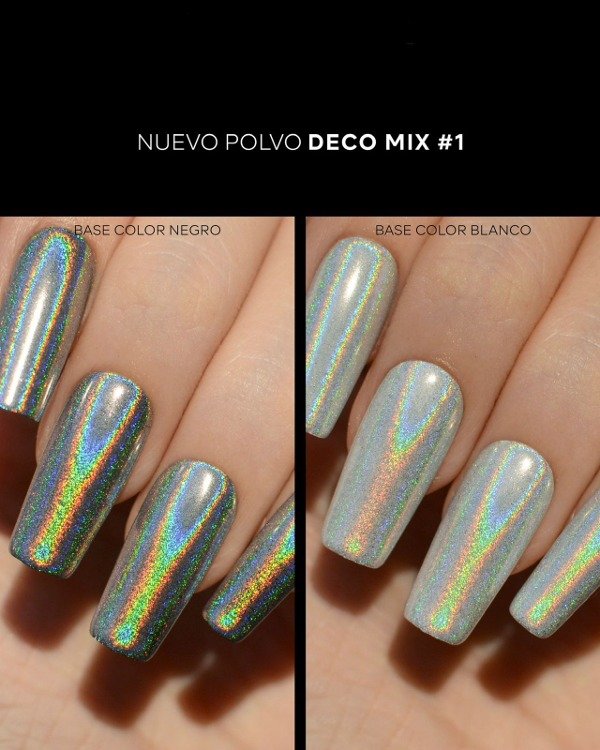 Los polvos Deco Mix son pigmentos que dejan acabados holográficos, holográfico rainbow, cromados translúcidos y plenos.